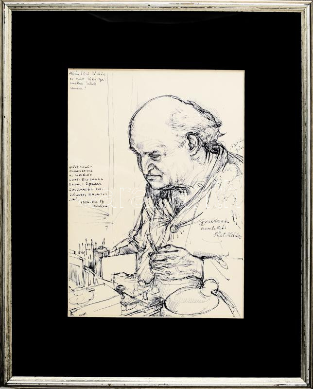 Beschreibung: László Gyula (1910-1998): Füst Milán portréja (Füst Milán elmondotta új meséjét...), 1956. VIII.17. Tus, papÃr, László Gyula által jelzett és Füst Milán autográf dedikációjával László Gyula részére, üvegezett fakeretben, 29×20,5 cm