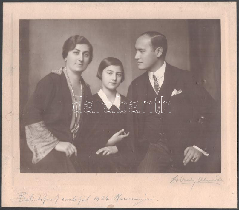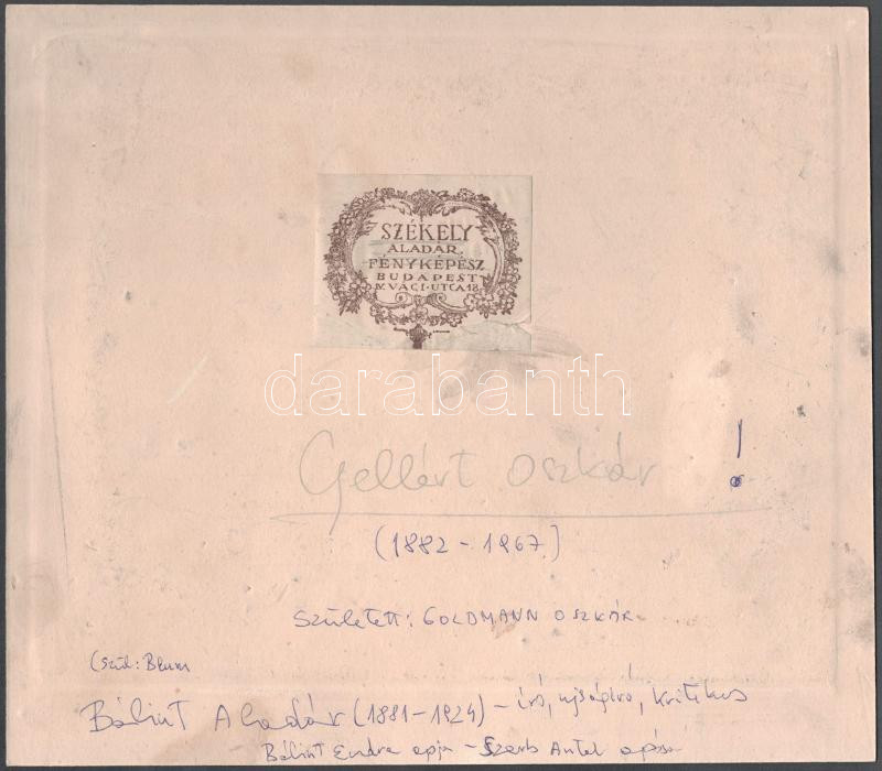 Székely Aladár (1870-1940): Gellért Oszkár (1882-1967) költő, újságíró, szerkesztő, a Nyugat főmunkatársa és családja, Székely Aladár által ceruzával jelzett és Gellért Oszkár által Bálintéknak (Bálint Aladár író, újságíró, a Nyugat műkritikusának és családjának) dedikált fotóművészeti alkotás, kartonon, apró felületi sérülésekkel, 17x22,5 cm