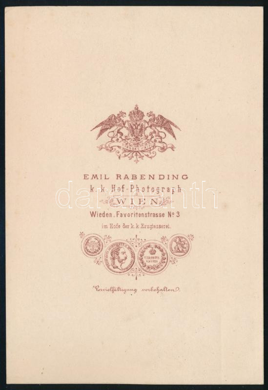 cca 1870 Emil Egon zu Fürstenberg (1825-1899) herceg, a német-osztrák Fürstenberg család königshof hercegi ágának feje, az Aranygyapjas rend lovagja, őrnagy, cs. kir. kamarás, valóságos belső titkos tanácsos. Kabinetfotó Emil Rabending cs. kir. udvari fényképész bécsi műterméből, jó állapotban, 16x11 cm // cca 1870 Emil Egon Prinz zu Fürstenberg (1825-1899), head of the Königshof branch of the German-Austrian princely house of Fürstenberg, knight of the Order of the Golden Fleece, major, chamberlain and privy counselor. Cabinet card from the studio of Emil Rabending in Vienna (Wien), in good condition, 16x11 cm