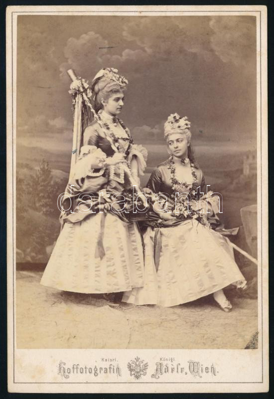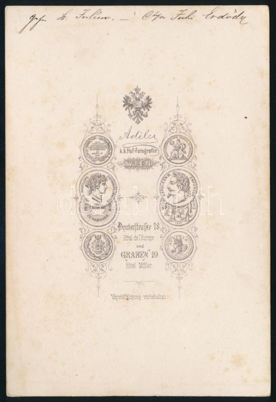 cca 1870 gróf Erdődy Júlia (1847-1901) császári és királyi palotahölgy, csillagkeresztes hölgy, egy másik előkelő, fiatal nemes hölgy (Gräfin Stefanie Saint-Julien) társaságában. Kabinetfotó Adéle cs. kir. udvari fényképész bécsi műterméből, a hátoldalon feliratozva, jó állapotban, 16,5x11 cm