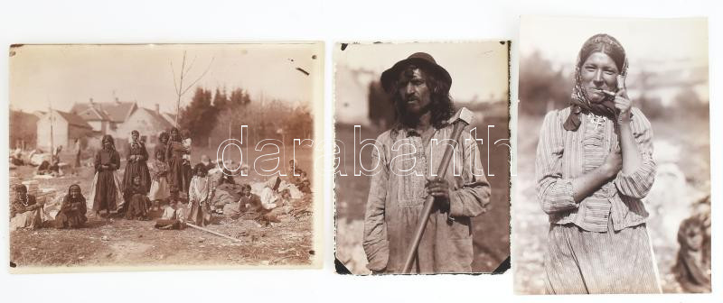 cca 1920-1930 Keszthely, Cigány szociográfiai / folklór fotók, 3 db: pipázó cigány nő, teknővájó cigány férfi portréi, valamint cigány nők és gyerekek csoportképével, a hátoldalon jelzett (Vajda, Keszthely), a csoportkép sarkain apró gyűrődésnyomokkal, 14x10 cm, 12x9 cm, 11,5x16 cm