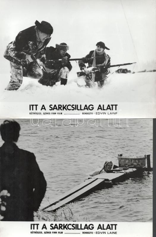 cca 1989 előtt készült, "Itt a sarkcsillag alatt" című finn film jelenetei és szereplői, 9 db vintage produkciós filmfotó (vitrinfotó, lobbyfotó) ezüst zselatinos fotópapíron, a használatból eredő (esetleges) kisebb hibákkal, 18x24 cm