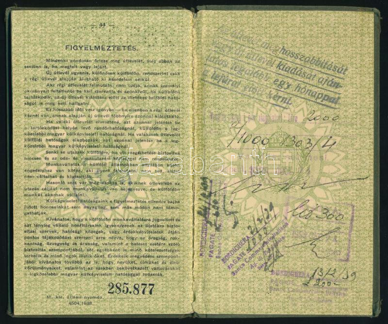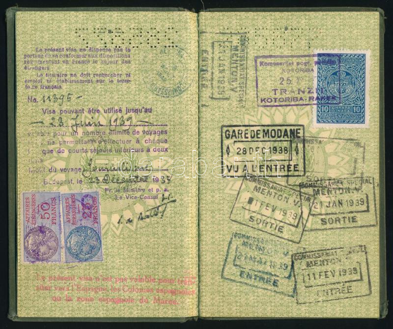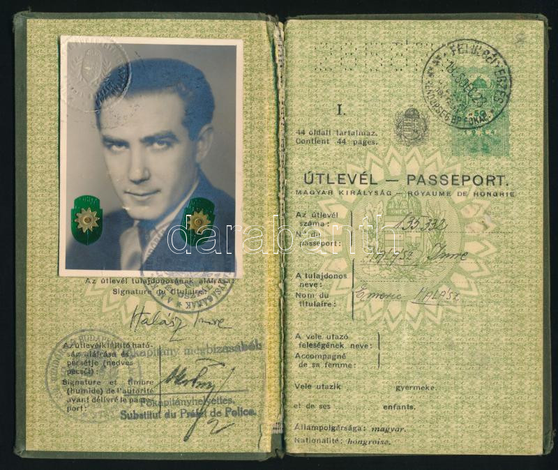 1938-39 Éri-Halász Imre (1900-1945?) író, újságíró, fényképes magyar útlevele, francia vízummal, okmánybélyegekkel és bélyegzésekkel, valamint jugoszláv és olasz bélyegzésekkel, kissé kopott és gerincén kissé sérült vászonkötésben. Éri-Halász Imre a Reggel című lapnak volt a munkatársa az 1920-as években, majd számos sikeres színmű szerzőjeként vált ismertté. A legismertebb az Egy csók és más semmi, amelyet 1941-ben került a mozikba. A vészkorszak idején Keresztúry Dezső talált számára búvóhelyet ismerőseinél, Zalaegerszegen. Éri-Halász Imre azonban nem sokáig bírta idegekkel. Vagy a feljelentéstől félt, vagy attól, hogy rejtegetőit hozza veszélybe, feladta magát a németeknek. Ettől kezdve nyoma veszett. Halálának körülményei ismeretlenek, feltehetően 1945 január végén Zalaszentgróton ölték meg.