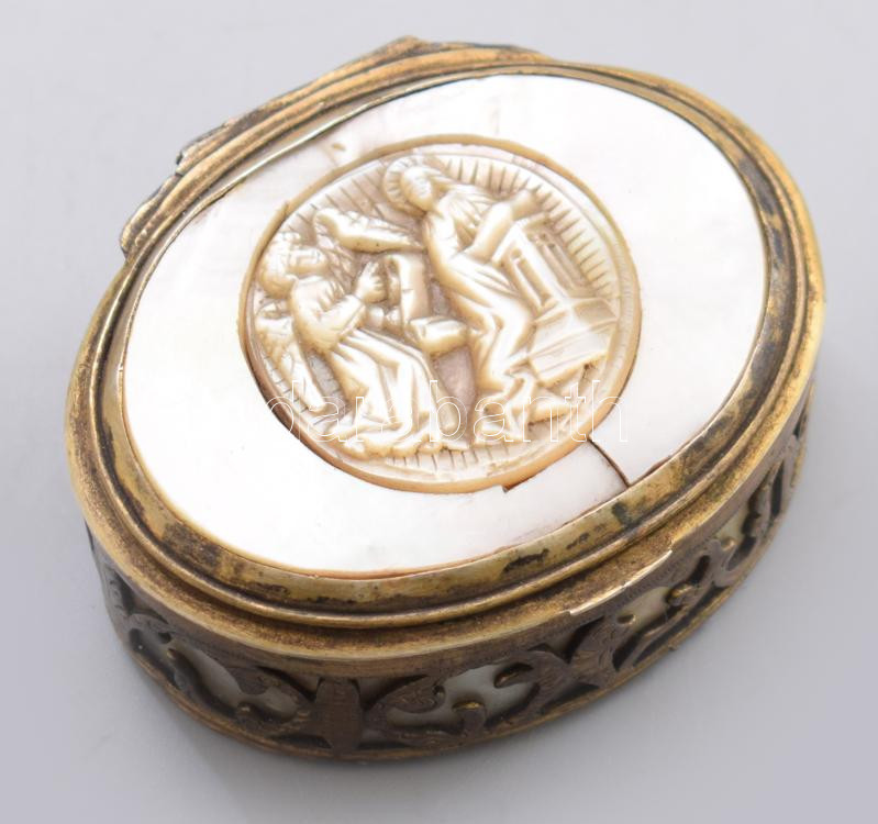 Beschreibung: Szelence. cca 17-18. sz., gyöngyház, réz, fa, belül újabb bársonybéléssel, tetején beillesztett gyöngyház faragással, 7x5 cm