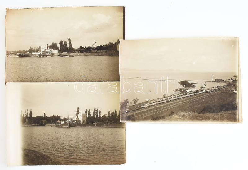 cca 1920-1930 Fonyódi kikötő fotói, 3 db fotó, a kikötőben hajókkal, az egyik fotón vasúttal is, a hátoldalán feliratozva, kisebb gyűrődésekkel, az egyik sarkán kis sérülésekkel, 12x17 cmx3