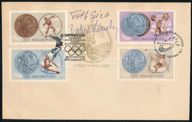 Beschreibung: 1968 Tóth Géza és Bakos Károly súlyemelő olimpikonok aláírásai Tokiói Olimpia FDC-n