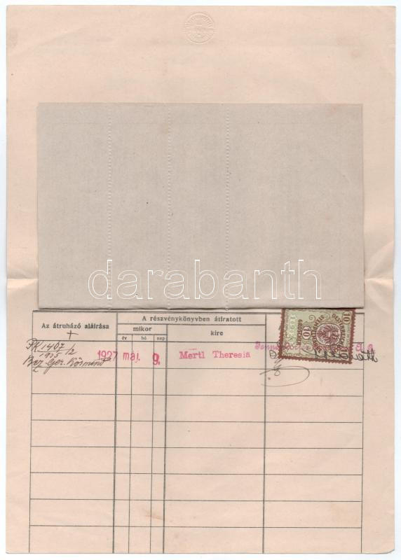Ausztria / Gyanafalva 1920. "Gyanafalvai Takarékpénztár Részvénytársaság" részvénye szárazpecséttel, szelvényekkel, bélyegzésekkel T:XF / Austria / Gyanafalva (Jennersdorf) 1920. "Savings Bank Joint Stock Company of Gyanafalva" share with embossed stamp, coupons and cancellations C:XF