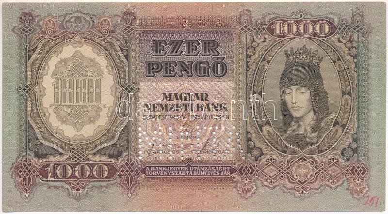 Hungary 1943. 1000 Pengő with "MINTA (specimen)" perforation, "000" serials C:AU, small corner folds, in the lower-right corner pencil written "251" mark