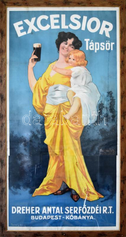 Excelsior tápsör, Dreher Antal Serfőzdéi R. T., Budapest-Kőbánya, hatalmas méretű szecessziós reklámplakát, Tolnay Ákos (1861-1932) festőművész jelzett alkotása, 1910-15 körül, litográfia, papír, Bruchsteiner és Fia Bp., javított, hajtásnyomokkal, gyűrődésekkel, plexiüvegezett fakeretben, 181x82 cm. Rendkívül ritka, becses gyűjtői darab, plakátgyűjtők vágya! KIZÁRÓLAG SZEMÉLYES ÁTVÉTEL, NEM POSTÁZZUK! / Very rare, huge art nouveau poster, lithograph on paper, 181x82 cm, framed. ONLY PERSONAL COLLECTION AT OUR OFFICE!