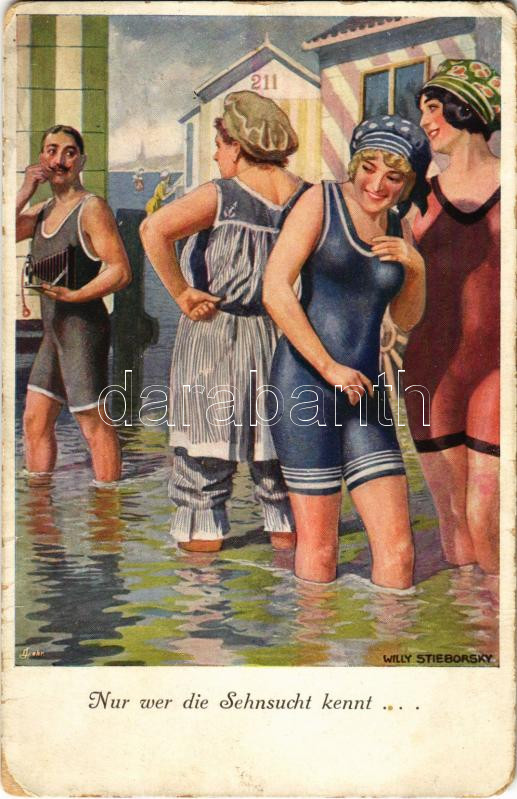 Nur wer die Sehnsucht kennt... / Hölgyek a strandon, finoman erotikus képeslap / Ladies on the beach, gently erotic. W.R.B. & Co. Serie 22-83. s: Stieborsky Willy (EK)