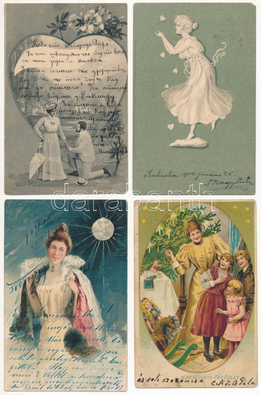 20 db RÉGI hosszú címzéses motívum képeslap vegyes minőségben, lithok is: hölgyek, szerelmes párok / 20 pre-1910 motive postcards in mixed quality: ladies, couples in love