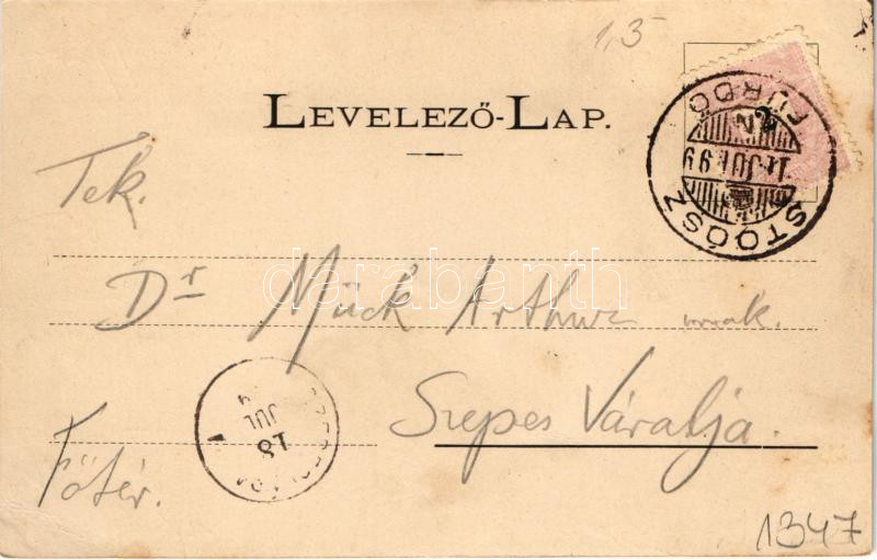Beschreibung: 1899 (Vorläufer) Stószfürdő, Stoósz-fürdő, Kúpele Stós; Dr. Czirfusz villa, délkeleti látkép, Hungária szálló főhomlokzata. Wlaszlovits Gusztáv kiadása / spa, villas, hotel. Art Nouveau, floral (EK)