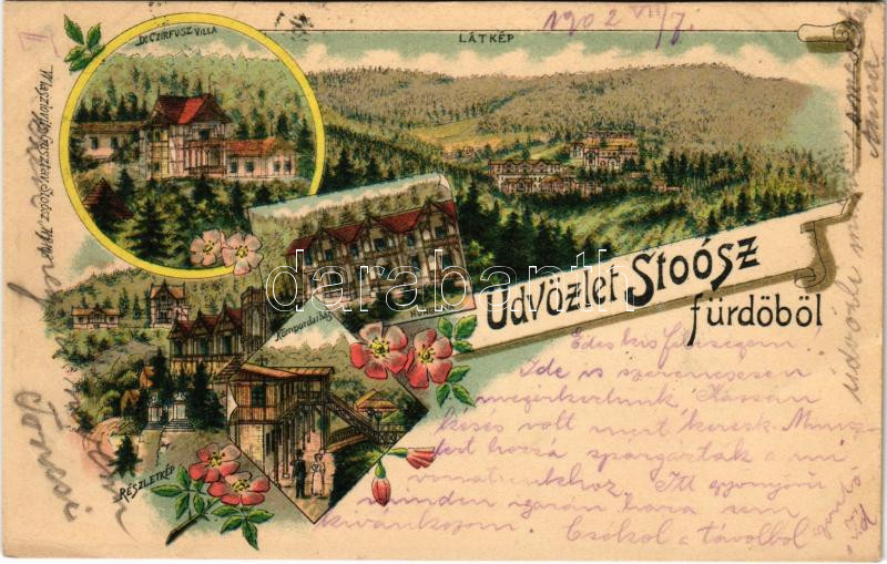 Beschreibung: 1902 Stószfürdő, Stoósz-fürdő, Kúpele Stós; Dr. Czirfusz villa, látkép, Hungária nyaraló, Kompordai ház. Wlaszlovits Gusztáv No. 103. / villas, spa. Art Nouveau, floral, litho (EK)