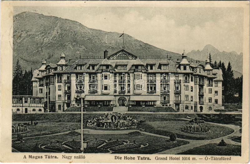 Beschreibung: 1916 Tátrafüred, Ótátrafüred, Altschmecks, Stary Smokovec (Tátra, Magas-Tátra, Vysoké Tatry); Nagy szálló. Kertész Tódor kiadása / Grand Hotel