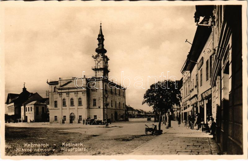 Késmárk, Kezmarok; Hlavné námestie / Hauptplatz, Kino / Fő tér, városháza, üzletek, automobilok, mozi / main square, town hall, shops, automobiles, cinema