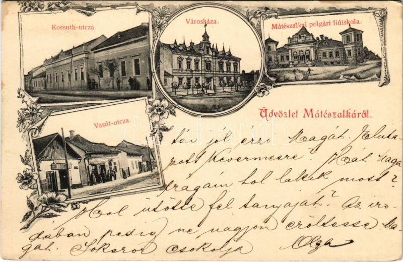 Beschreibung: 1908 Mátészalka, Kossuth utca, Városháza, Polgári fiúiskola, Vasút utca, Feldman Testvérek üzlete. Art Nouveau, floral (EK)