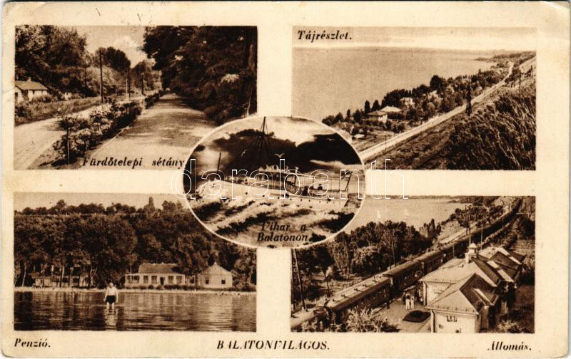 Balatonvilágos, Fürdőtelepi sétány, penzió, vasútállomás, tájrészlet, ... https://www.darabanth.com/de/440-Fernauktion/440.0/Ansichtskarten/Ungarn~2000005/Balatonvilagos-Furdotelepi-setany-penzio-vasutallomas-tajreszlet-vihar-a-Balatonon-~II2892027