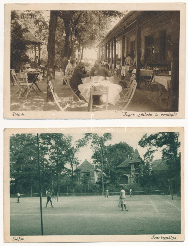 Siófok - 2 db régi képeslap (Fogas szálloda és vendéglő, tenisz pálya) https://www.darabanth.com/de/440-Fernauktion/440.0/Ansichtskarten/Ungarn~2000005/Siofok-2-db-regi-kepeslap-Fogas-szalloda-es-vendeglo-tenisz-palya~II2887939