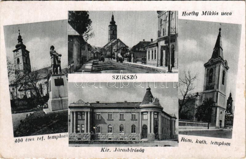 Beschreibung: Szikszó, Horthy Miklós utca, 400 éves református templom, Római katolikus templom, Kir. Járásbíróság. Stamberger Vilmos kiadása (EK)