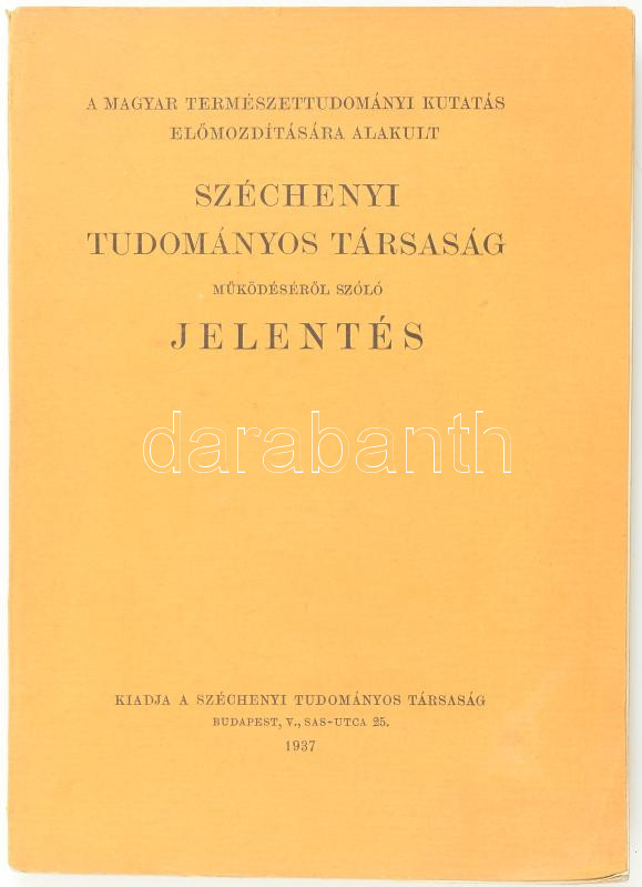 A magyar természettudományi kutatás előmozdítására alakult Széchenyi Tudományos Társaság működéséről szóló jelentés. Bp., 1937, Széchenyi Tudományos Társaság (Franklin-ny.), 141 p. Kiadói papírkötés