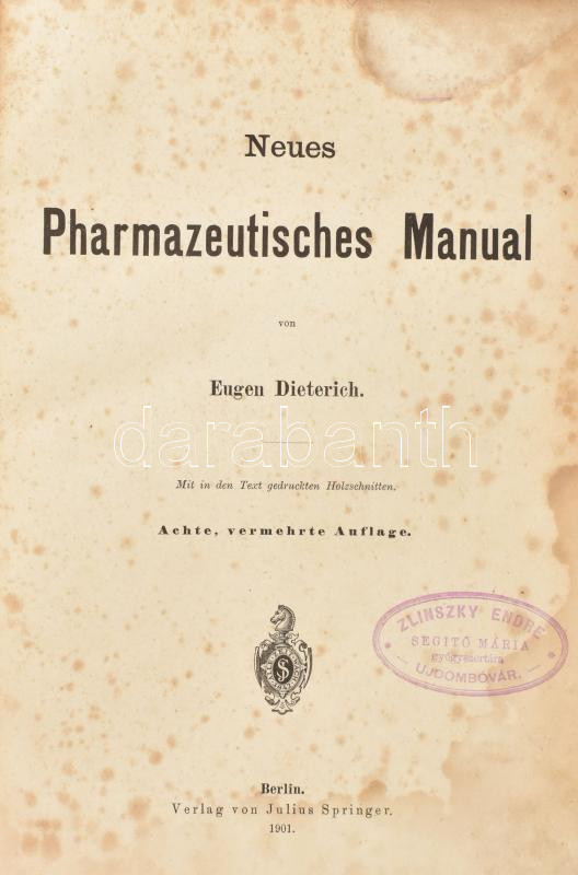 Eugen Dietrich: Neues Pharmazeutisches Manual. Berlin, 1901. Springer.... https://www.darabanth.com/de/440-Fernauktion/440.0/Bucher/Bucher-Andere-Sprachen~500052/Eugen-Dietrich-Neues-Pharmazeutisches-Manual-Berlin-1901-Springer-szovegkozti-fametszetu-il~II2886916