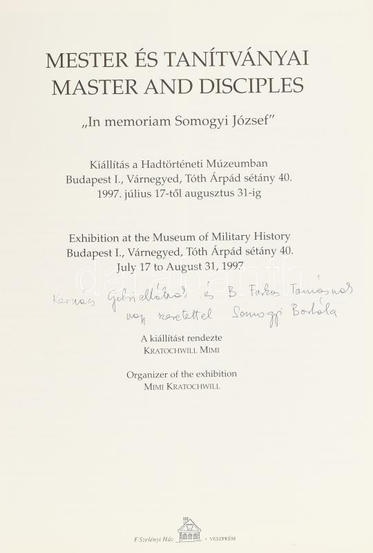 1997 Mester és tanítványai. Master and Disciples. "In memoriam Somogyi József." Kiállítási katalógus (Bp., Hadtörténeti Múzeumban, Bp.,1997.) Veszprém, 1997., F. Szelényi Ház. Gazdag képanyaggal illusztrált. Kiadói papírkötés. A művész lánya, BÁV oktató, Somogyi Borbála által Kernács Gabriella (1943-2021) művészettörténész és férje B. Farkas Tamás (1937-2016) filmrendező részére szóló ajándékozási sorokkal.