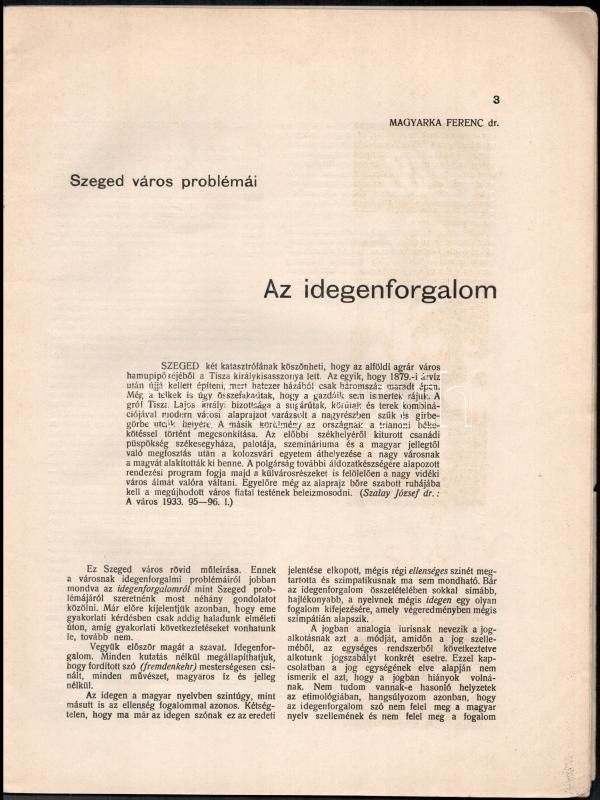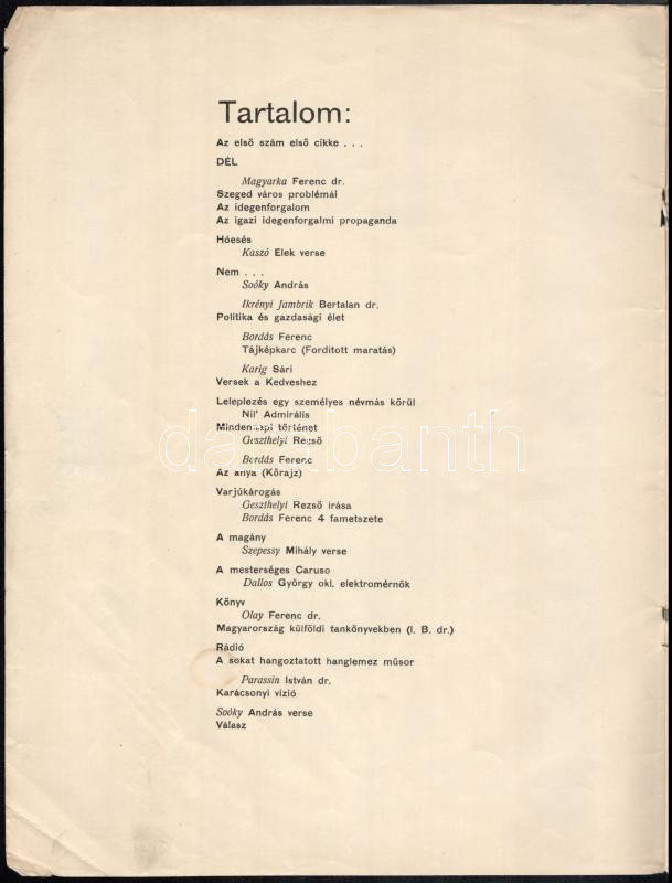 A Dél c. folyóirat induló száma (I. évf. 1. sz.). Szerk.: dr. Magyarka Ferenc. Szeged, é.n., "Árpád"-ny., 24 p.+3 t. Benne többek közt Magyarka Ferenc: Szeged város problémái c. írásával, Bordás Ferenc illusztrációival. Kiadói tűzött papírkötés, szétváló tűzéssel, a lapok egy része kijár.