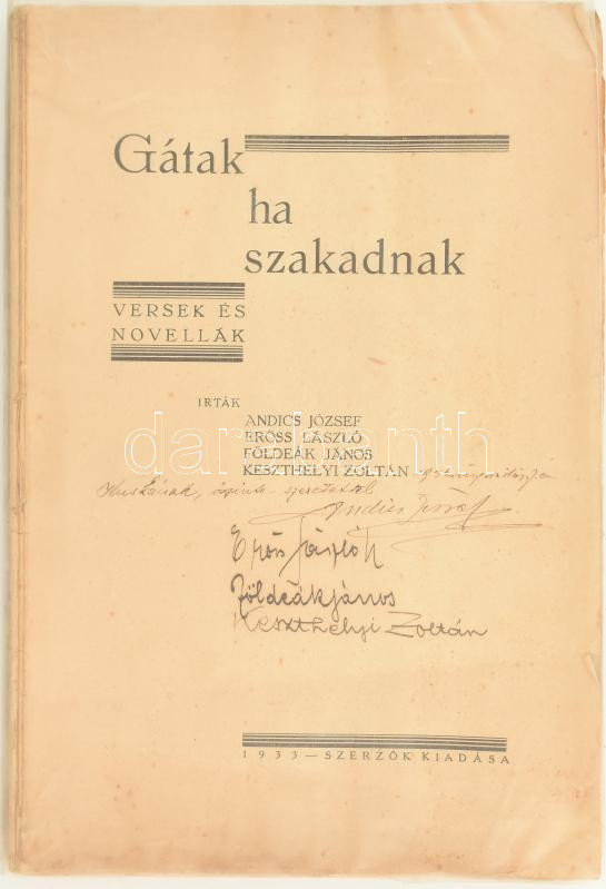 Andics József - Erőss László - Földeák János - Keszthelyi Zoltán: Gátak ha szakadnak. Versek és novellák. A szerzők általi négyes DEDIKÁCIÓVAL! (Bp.), 1933., Szerzők (Budai Napló - ny.) 94+2 p. Borító nélküli példány, kissé foltos lapokkal, kis szakadásokkal.