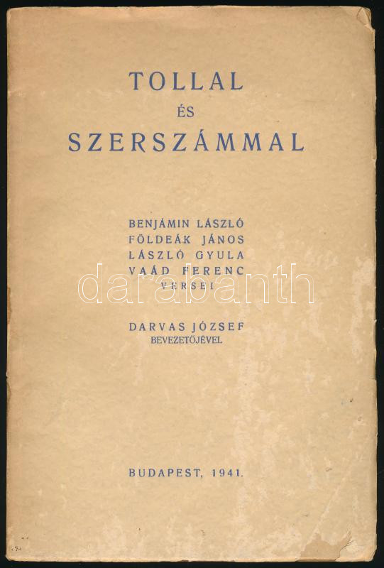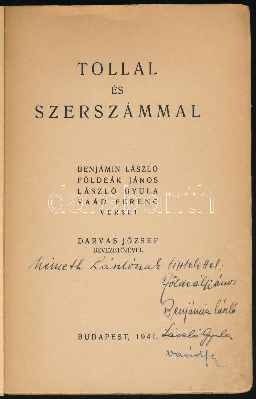 Benjámin László et alii.: Tollal és szerszámmal. Benjámin László, Földeák János, László Gyula, Vaád Ferenc versei. Darvas József bevezetőjével. A szerzők, Benjámin László (1915-1986), Földeák János (1910-1997), László Gyula (1915-1998), Vaád Ferenc (1908-1984) által DEDIKÁLT példány. Bp., 1941.,(Rajkai Lajos-ny.), 128 p. Kiadói papírkötés, kissé foltos borítóval, az elülső borítón kis sérüléssel, felvágatlan példány.