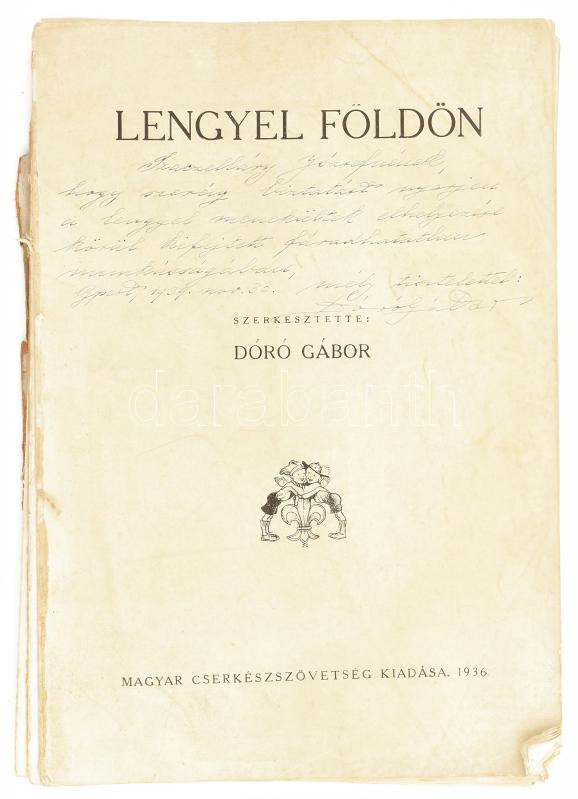 Lengyel földön. Szerk.: Dóró Gábor. A szerkesztő, Dóró Gábor által DEDIKÁLT példány. Bp., 1936, Magyar Cserkészszövetség. Borító nélkül, rossz széteső állapotban.