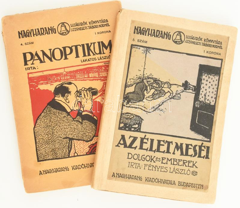 Nagyharang Ujságirók Könyvtára 4-5. sz.: Lakatos László: Panoptikum. Bp., [1912], Nagyharang, 126+2 p. Kiadói illusztrált papírkötés, szakadt borítóval, sérült gerinccel.; Fényes László: Az élet meséi. Bp.,[1912], Nagyharang, 127+1 p. Átkötött papírkötés, az eredeti borító felhasználásával.;