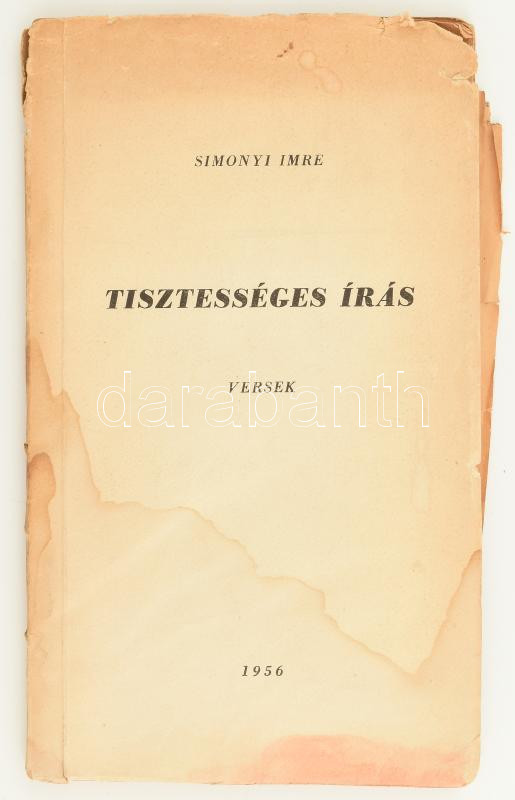 Simonyi Imre: Tisztességes írás. Versek. A szerző, Simonyi Imre által "Tímár József" színésznek DEDIKÁLT példány, de aláírás nélkül. Gyula, 1956, Gyula Városi Tanács Népművelési Osztálya. Kiadói papírkötés, sérült gerinccel, az elülső borító felső sarkán kis sérüléssel, foltos.