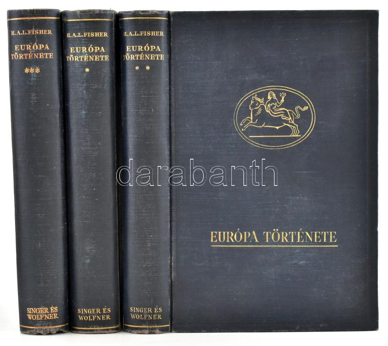 H. A. L. Fisher: Európa története I-III. köt. I. köt.: Ókor és középkor. II. köt.: Renaissance, reformáció, felvilágosodás. III. köt.: A liberális kísérlet. Teljes! Ford.: Balla Antal és Benedek Marcell. Bp., é.n., Singer és Wolfner, 415+1; 459+1; 507 p. Térképekkel illusztrált. Kiadói dúsan aranyozott egészvászon kötés, a borítókon kopásnyomokkal.
