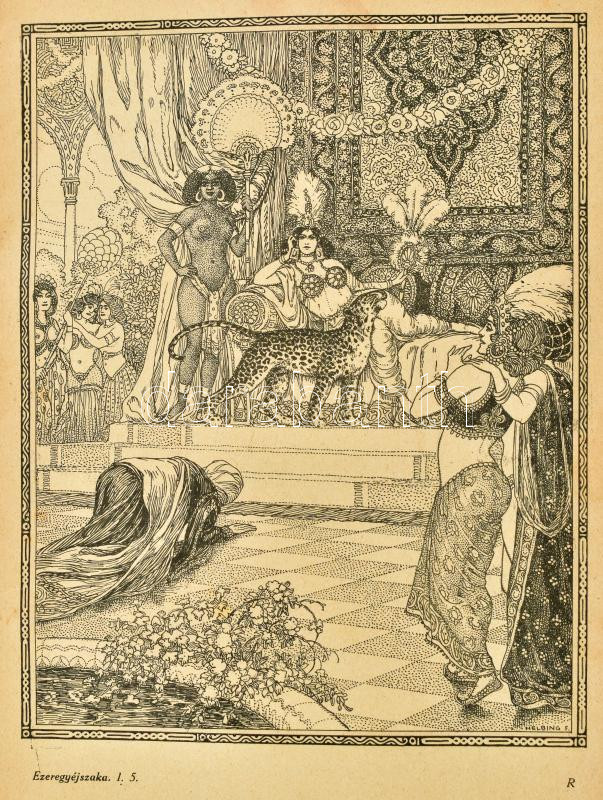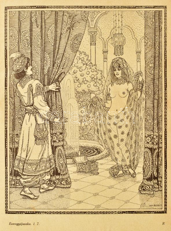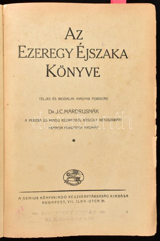 Az Ezeregy Éjszaka Könyve. Teljes és irodalmi magyar fordÃtás. Dr. J. C. Mardusnak a perzsa és hindu kéziratból készült betűszerinti francia fordÃtása nyomán. I. kötet. Bp., ,Genius,(Jókai-ny.), 366 p.+6 t. Külön lenyomat tudományos körök és bibliophilek részére 600 számozott példányban, Helbing, Pólya Tibor, Chantheau Miklós, és Azary Prihoda István rajzaival. Kiadói félbÅ‘r-kötés, kopott borÃtóval, sérült gerinccel, egy kijáró lappal (137/138), egy hiányzó táblával, laza fűzéssel. Számozott (144./600) példány.