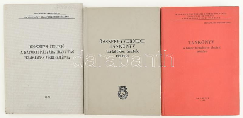 Beschreibung: 3 db militária témájú könyv: Módszertani útmutató a katonai pályára irányítás feladatainak végrehajtására. H.n., 1976, HM MN személyügyi főcsoportfőnökség. Egészvászon kötésben. + Molnár József et. al.: Összfegyvernemi tankönyv tartalékos tisztek részére. Bp., 1965. Magyar Honvédelmi Sportszövetség. Címlapon "Szolgálati használatra" intézményi bélyegzéssel. Nyl-kötés. + Enzsől Gyula et. al.: Tankönyv a tüzér tartalékos tisztek részére. Bp., 1965. Magyar Honvédelmi Sportszövetség. Címlapon "Szolgálati használatra" intézményi bélyegzéssel. Egészvászon kötésben.