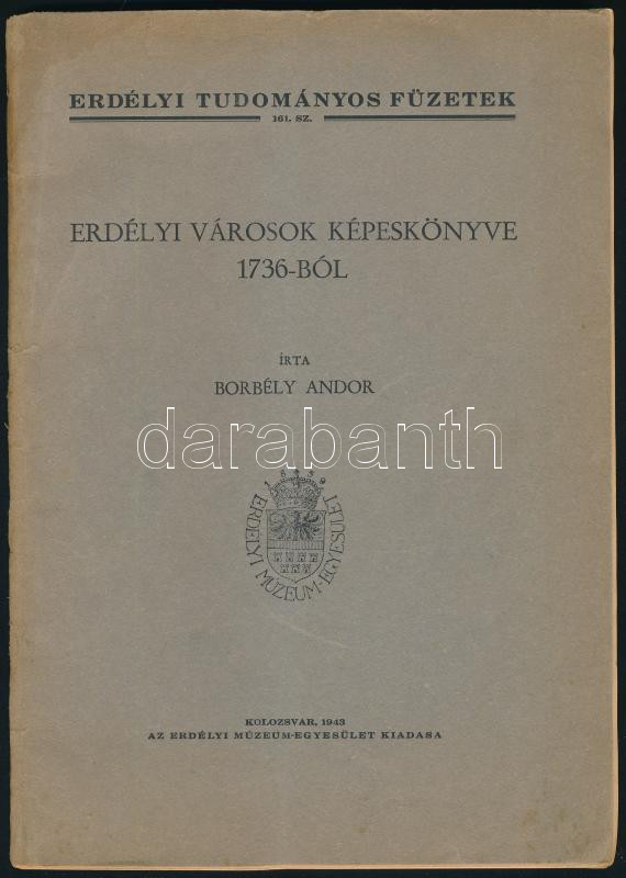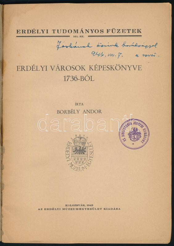 Borbély Andor: Erdélyi városok képeskönyve 1736-ból. A szerző, tordai Borbély Andor (1896-1972) térképész, földrajztanár által DEDIKÁLT példány. Erdélyi Tudományos Füzetek 161. sz. Cluj/Kolozsvár, 1943., Erdélyi Múzeum-Egyesület, 21 p.+ 21 t. Különlenyomat. Kiadói papírkötés, aláhúzásokkal.