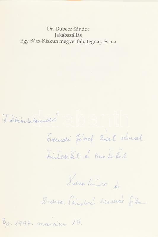 Dubecz Sándor: Jakabszállás. Egy Bács-Kiskun megyei falu tegnap és ma. A szerző, id. Dr. Dubecz Sándor (1916-2006) és felesége által Szendi József (1921-2017) veszprémi érsek részére DEDIKÁLT példány. Lakitelek, 1994., Antológia. Kiadói papírkötés