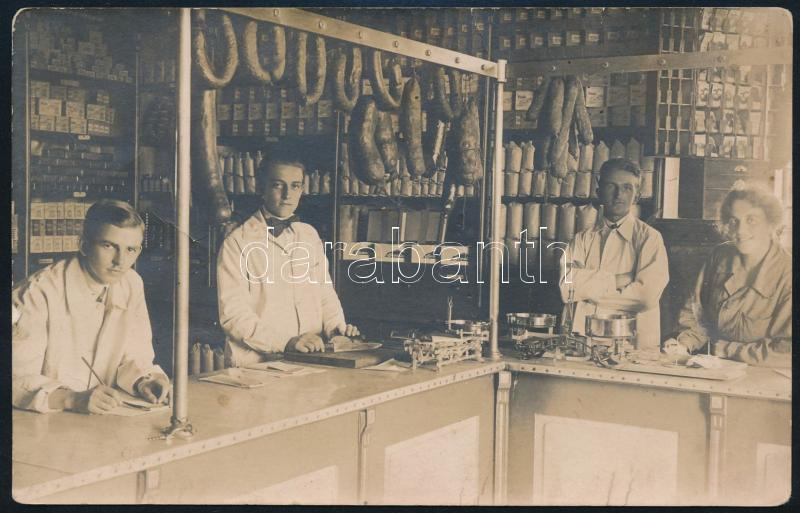 cca 1920 Fűszerüzlet belső képe kolbászokkal, fotólap, felületén törés... https://www.darabanth.com/de/440-Fernauktion/440.0/Fotografie/Foto~500023/cca-1920-Fuszeruzlet-belso-kepe-kolbaszokkal-fotolap-feluleten-toresnyomok-9C39713-cm~II2893162
