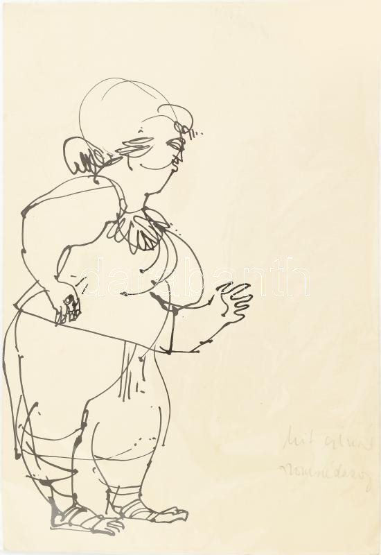 Beschreibung: Csohány Kámán (1925-1980):. Mit csinál szomszédasszony. Tus, papír, jelzés nélkül, megjelent Obersovszky Gyula: Játékos istenek. c. 22x16 cm