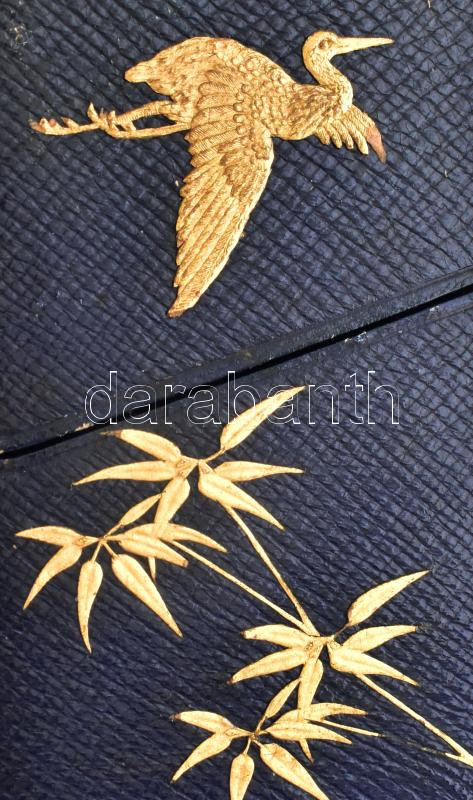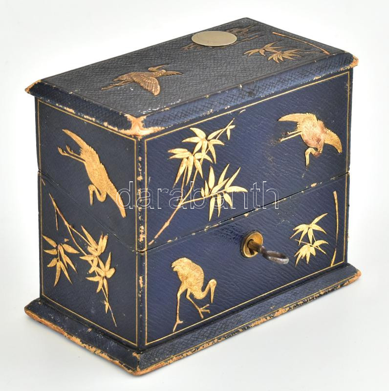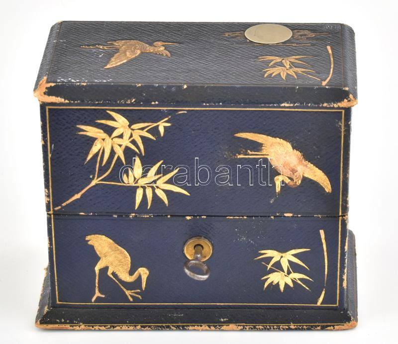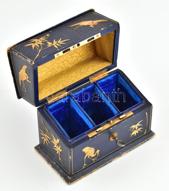 Beschreibung: Úti parfűm tároló három rekesszel. Bársony, aranyozott bőr, kulccsal. Kopott. Gerlóczy Gedeon hagyatékából 13x14x8 cm