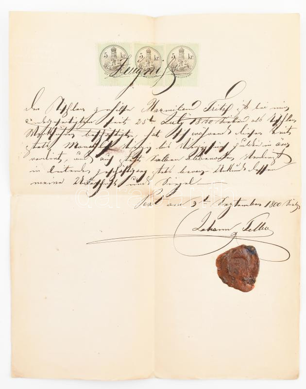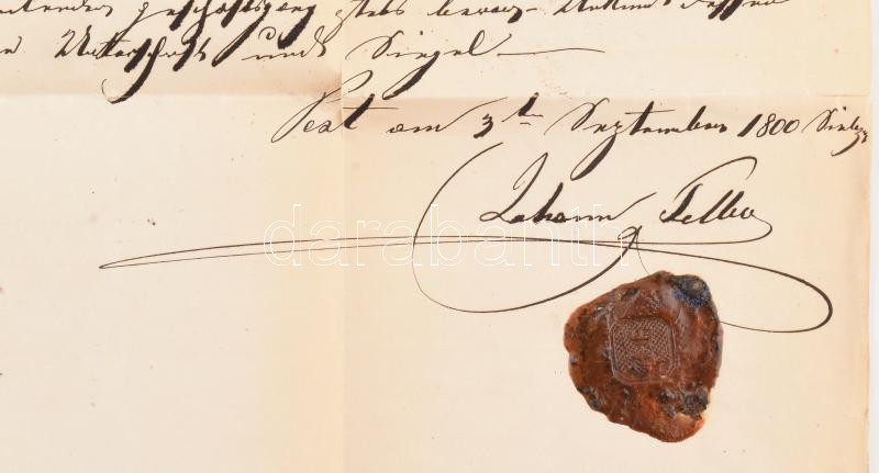 1800 Johann Felber Taschner német nyelvű tanúsítvány, viaszpecséttel, ... https://www.darabanth.com/de/440-Fernauktion/440.0/Kunst-Dokumente-andere-Sammelgebiete/Dokument~500020/1800-Johann-Felber-Taschner-nemet-nyelvu-tanusitvany-viaszpecsettel-5plus5plus5-kr-okmanybelyegg~II2893349