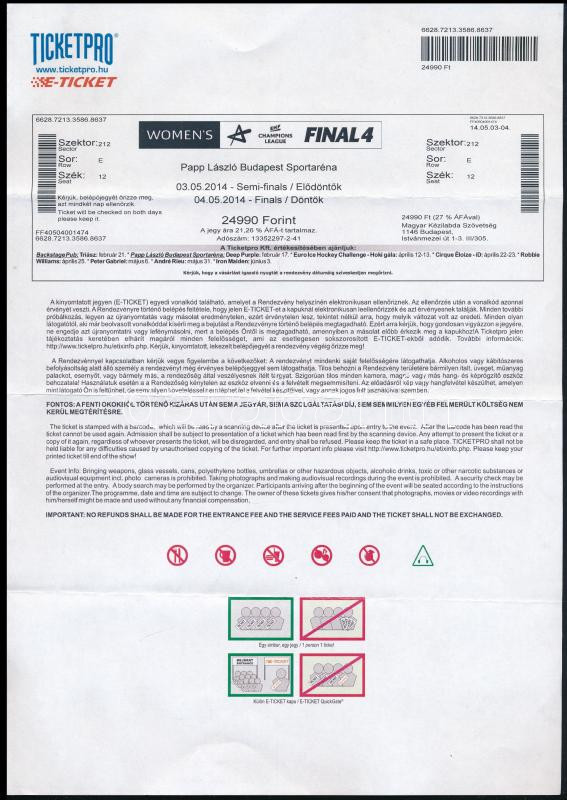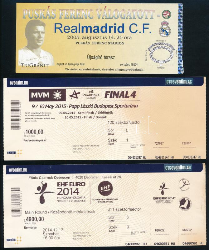 2005 Puskás Ferenc Válogatott - Real Madrid C.F. labdarúgó-mérkőzés belépőjegy + 2015 EHF Champions League (női kézilabda) középdöntő és elődöntő belépőjegyek