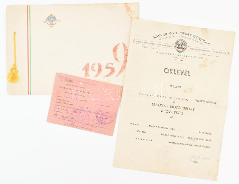 Tarcsi Károly motorversenyző papírjai (versenyvezetői igazolvány, okle... https://www.darabanth.com/de/440-Fernauktion/440.0/Kunst-Dokumente-andere-Sammelgebiete/Dokument~500020/Tarcsi-Karoly-motorversenyzo-papirjai-versenyvezetoi-igazolvany-oklevel-stb~II2892710