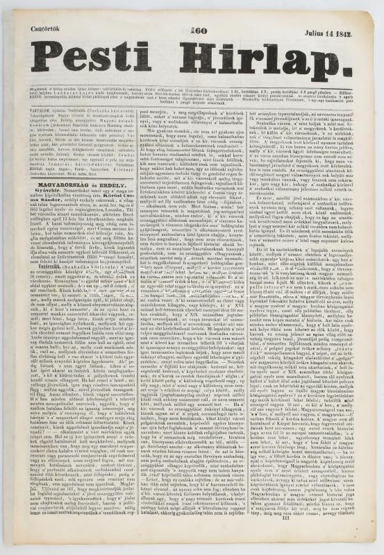 1842 Pesti Hírlap 160. sz. Julius 14. 1842. Szerk.: Kossuth Lajos. A címlapon Kőrösi Csoma Sándor halálhírével. Pest, Landerer Lajos, restaurált, 491-498 p. Benne korabeli hírekkel, érdekes írásokkal, korabeli reklámokkal, gőzhajómenetrendekkel, gabonaárakkal.
