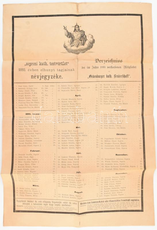 1894 A ,,soproni kath. tesvtérület" 1893. évben elhunyt tagjainak névjegyzéke, kétnyelvű hirdetmény, Sopron, Reininger Ármin-ny., hajtott, kis szakadással, 50x34 cm