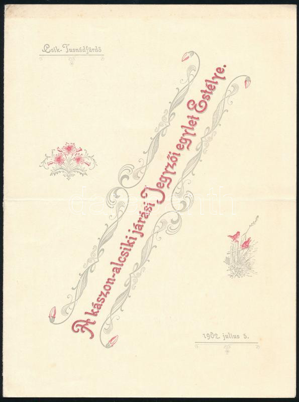 1902 Csík-Tusnádfürdő, a kászon-alcsíki jegyzői egylet meghívója zártk... https://www.darabanth.com/de/440-Fernauktion/440.0/Kunst-Dokumente-andere-Sammelgebiete/Drucksachen~500035/1902-Csik-Tusnadfurdo-a-kaszon-alcsiki-jegyzoi-egylet-meghivoja-zartkoru-tancestelyre~II2889217