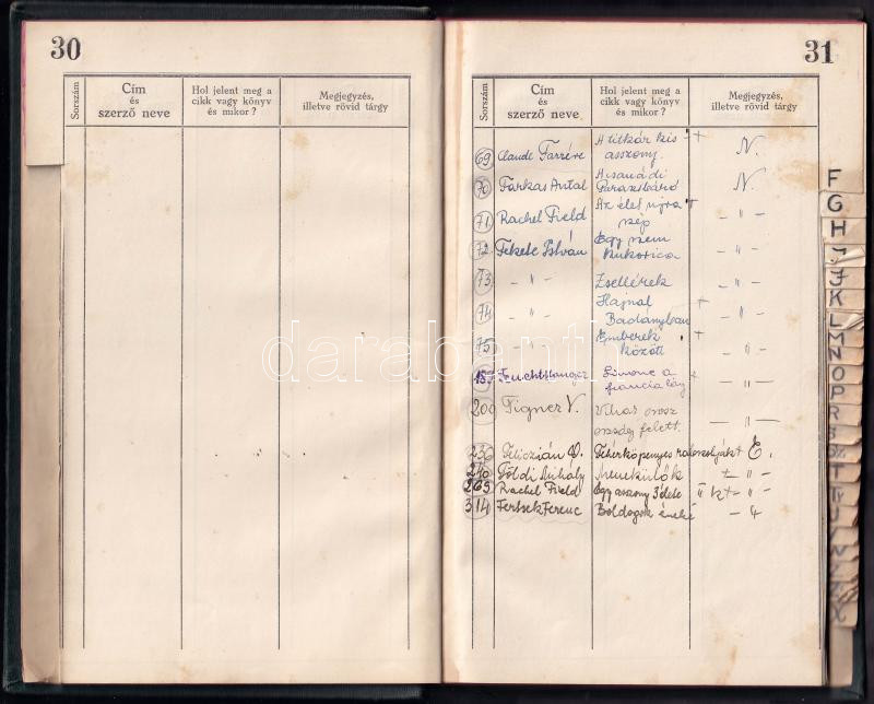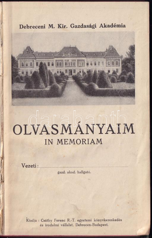 cca 1920-1940 Olvasmányaim - In memoriam. Debreceni M. Kir. Gazdasági Akadémia. Jegyzetfüzet regiszterrel, bejegyzésekkel. Kiadja: Csáthy Ferenc Rt., Debrecen-Bp. Kiadói aranyozott egészvászon-kötésben.