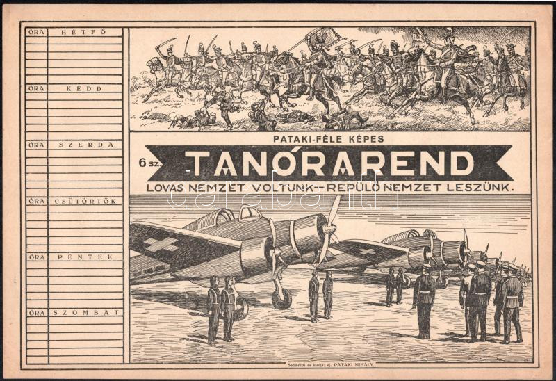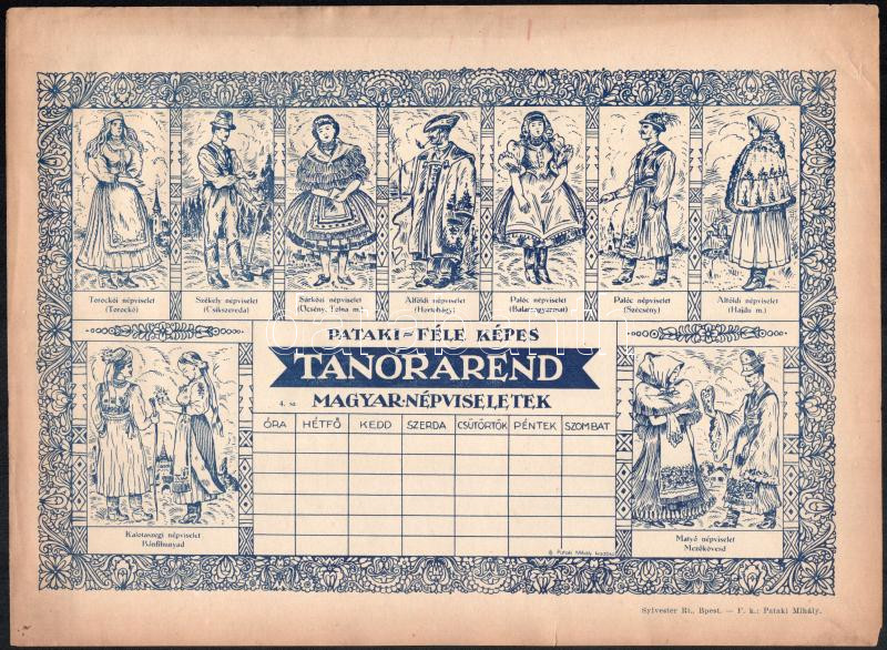 cca 1930-1940 Pataki-féle képes tanórarend, 2 db különböző (repülős, magyar népviseletek), kitöltetlen, az egyiken kis lapszéli szakadások, 29,5x20 cm és 31,5x23 cm