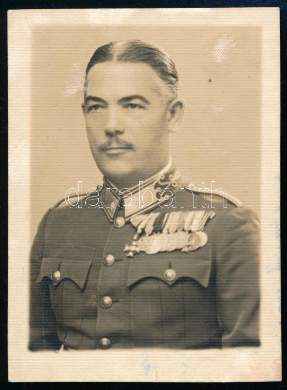 1942 Katonatiszt portréja, számos kitüntetéssel (Katonai Érdemkereszt III. osztálya, Károly-csapatkereszt, Magyar Háborús Emlékérem, stb.); fotó, a hátoldalon datált, pecséttel jelzett (Nesselroth Fotó Baja), 9x6,5 cm