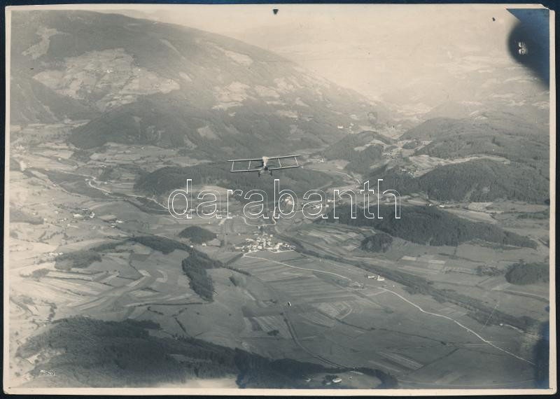 Beschreibung: cca 1914-1918 I. világháborús légifotó repülőgéppel a képen,(német gép?), fotó, a hátoldalon feliratozva, egy sarkán kis hiánnyal, 12x16 cm
